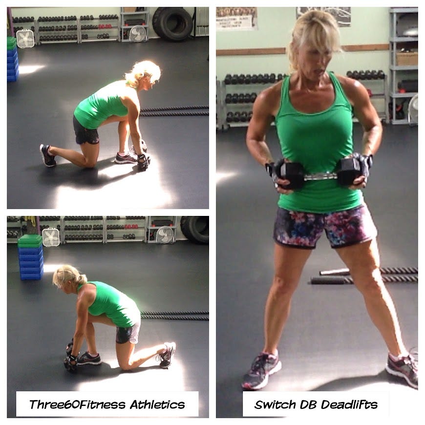 Exercise 5 (Switch DB Deadlifts) - Start with feet apart and db held between two hands (right pic). Now turn to the right and drop the front knee down, bringing the back knee to the ground, while placing the db in front of the left toe (left top pic). Stand upright again, turn and do the same for the other side. Repeat seven times each side.