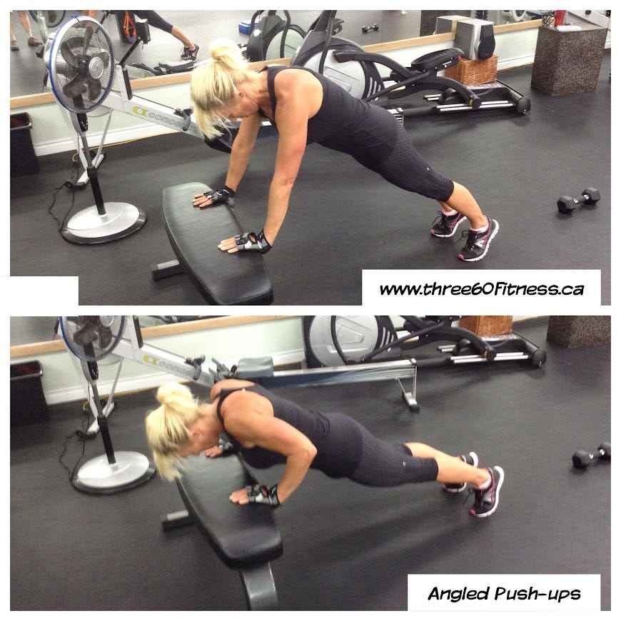 Exercise 6 (Angled Pushup) - use a bench or chair to modify this exercise if a regular pushup is too hard. Keep the torso straight with head forward and lower yourself to the chest on bench. Once to bottom position, push upwards to the straight arm position again and do for seven reps.