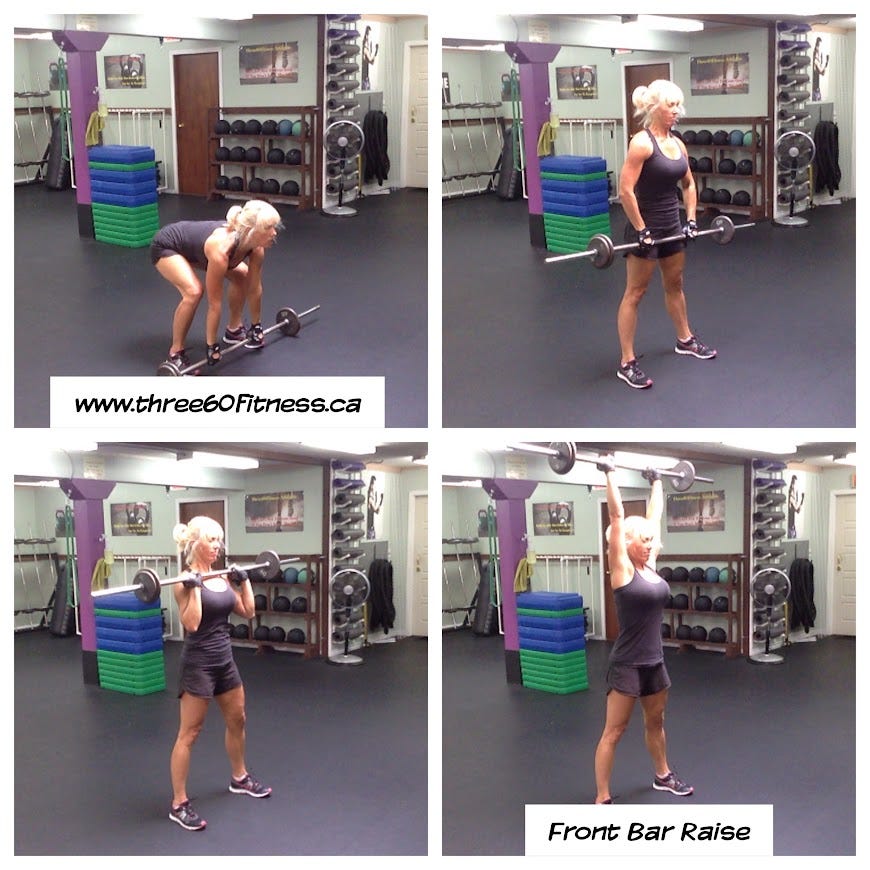 Exercise 2 (Front Bar Raise) - put hands on bar with an overhand grip, hips down and back tight (pic 1). Now pull the bar from the ground to the shoulders in one motion (pics 2 + 3). Keeping the torso tight, raise the bar from shoulder height to overhead position (pic 4). Repeat for seven reps.