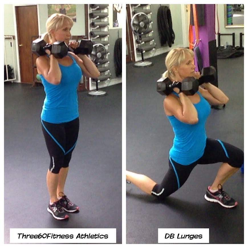 Exercise 4 (DB Lunges) - Start with db’s on shoulders and feet together (pic 1). Now lunge forward with one leg, keeping torso upright until back knee touches the ground (pic 2). Then step backwards and repeat for 7 reps (right leg) and seven reps (left leg).