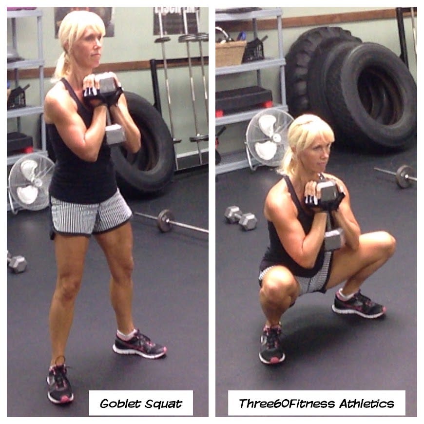 Exercise 7 (Goblet Squat) - In upright position, keep db in front by cupping it with hands and elbows underneath. Have toes slightly pointed outwards and feet apart (left pic). Now lower yourself into a squat position, with elbows at or near legs in bottom position (right pic). Stand and repeat for seven reps.