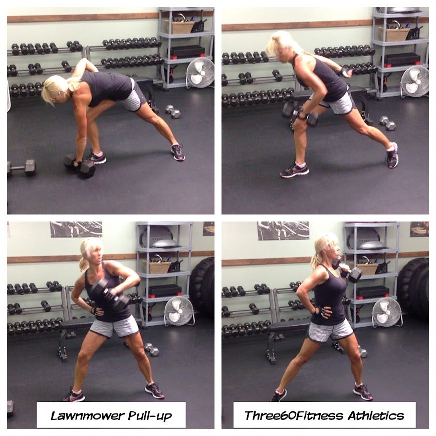 Exercise 3 (Lawnmower Pullup) - With front leg bent, place db in front of opposite foot and keep the back tight (pic 1). Now pull db upwards, brace back and allow the db to come towards side of chest (pics 2 + 3). In back position, db should be beside or slightly behind chest (pic 4) before travelling forwards again and down to opposite foot. (pic 1 again). Repeat for 7 reps per foot.
