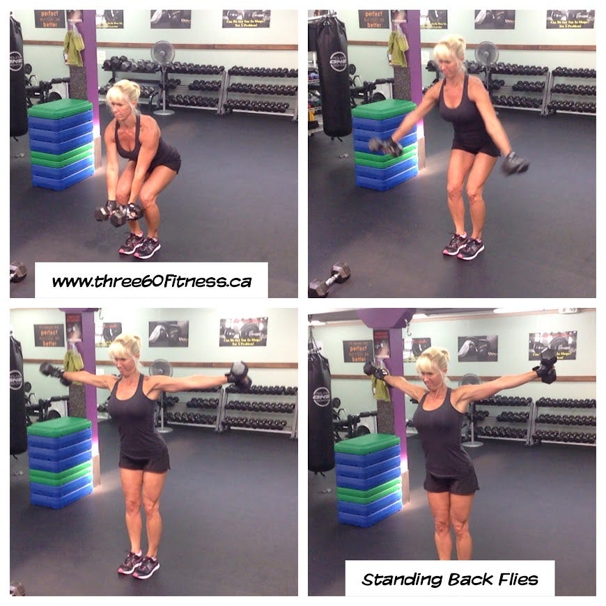 Exercise 1 (Standing Back Flies) - bend at knees with db’s out front. Keep the back tight as you start to raise dumbbells )pic 2). Now extend arms up and to side (pic 3) and straighten out your back while squeezing the shoulder blades together (pic 4). Repeat for seven reps.