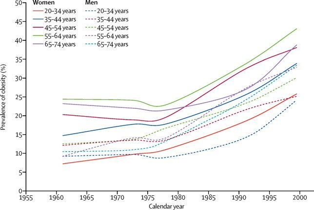 The increases in the prevalence of obesity began in the late 1970s across the entire North American population. The speed and extent of weight gain varied somewhat by age, sex and ethnicity, but for all subgroups most people became heavier at about the same time. So either all people had a simultaneous decline in willpower, or something else “snuck” into the picture.”