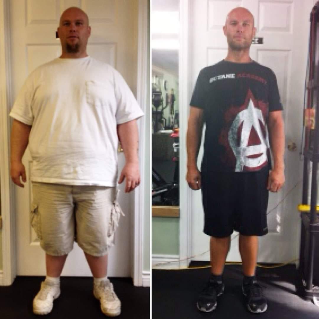 Unfortunately, he regained much of the weight back in my absence. But upon rejoining my program, he embraced the challenge anew, losing 75 pounds in the past year. Here are his current pictures:
